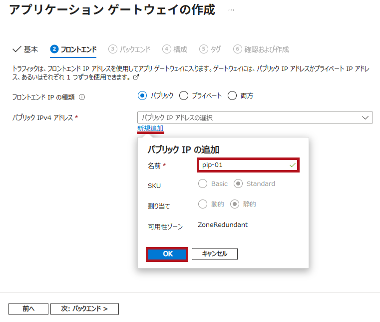 フロントエンドIP構成でパブリックを選択し、インターネットからのアクセスを受信する場合は、パブリックIPアドレスのリソースが必要です。