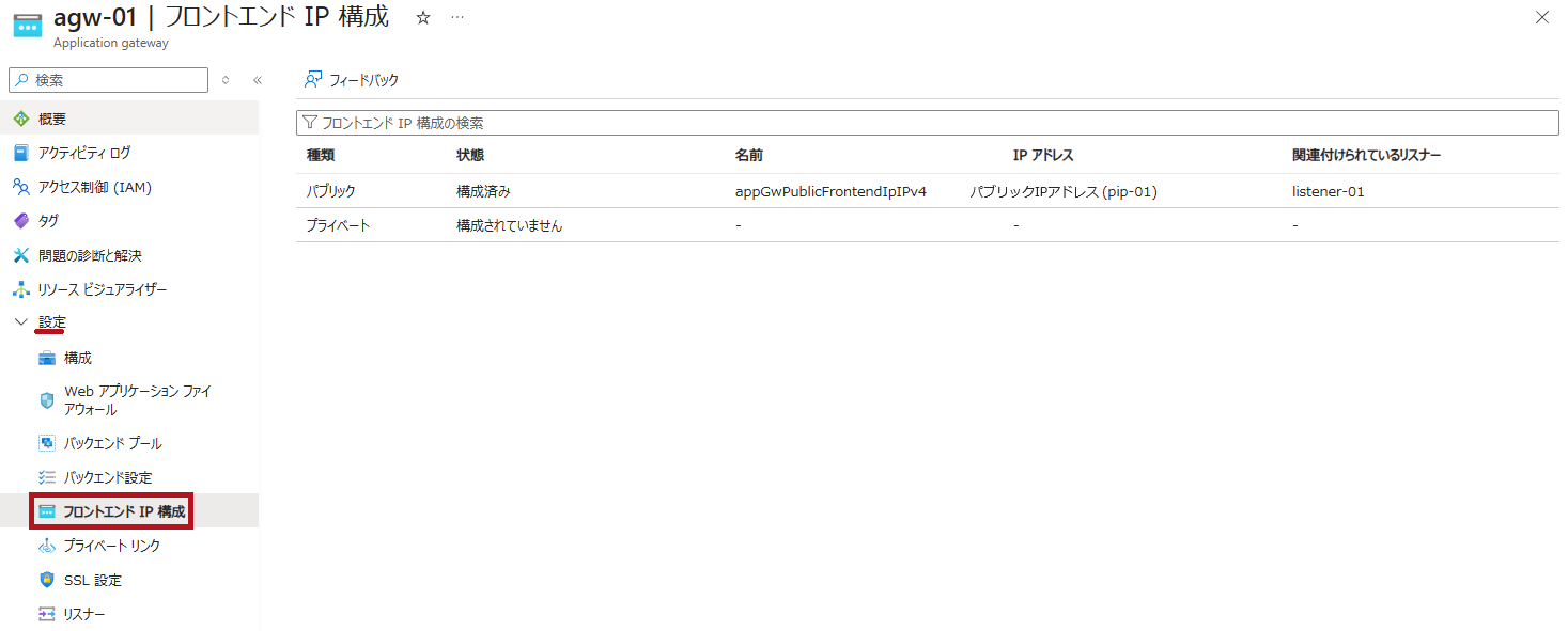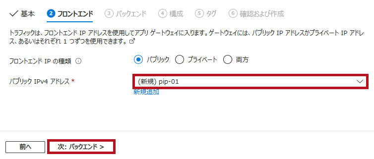 フロントエンドIP構成は、Application Gatewayがトラフィックを受信するためのIPアドレスを設定するものです。