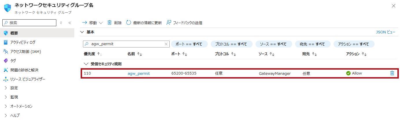 ネットワークセキュリティグループ(Application Gateway インフラストラクチャの構成)