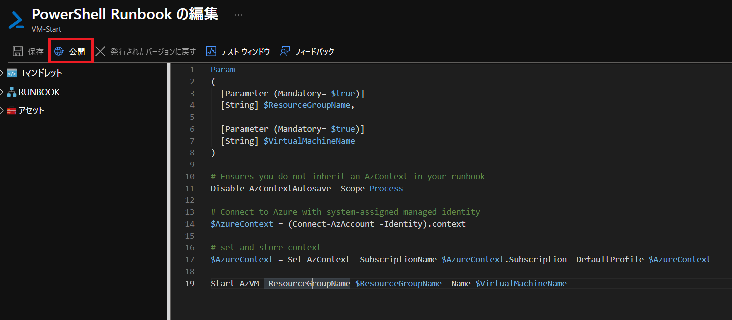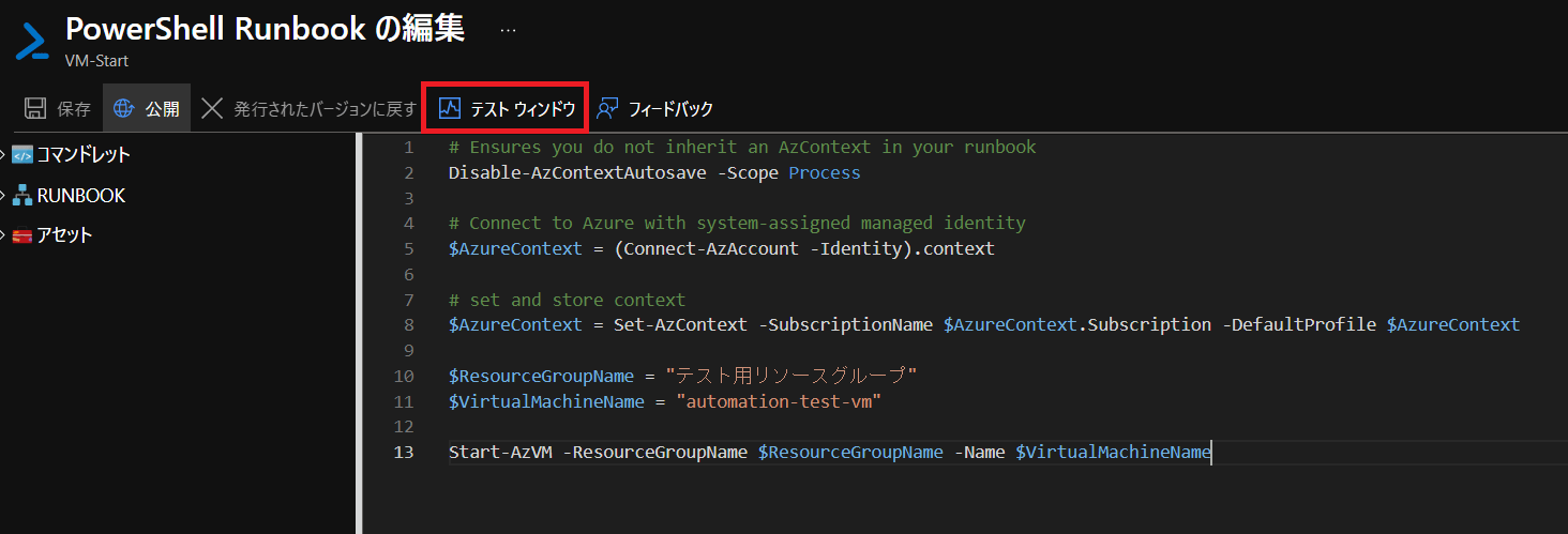 仮想マシンを起動するRunbookの作成、テスト、公開までの手順