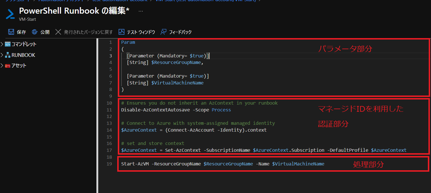 作成したRunbookは、パラメーター、システム割り当てマネージドIDを利用した認証、処理(仮想マシンの起動)を規定する内容で構成されています。