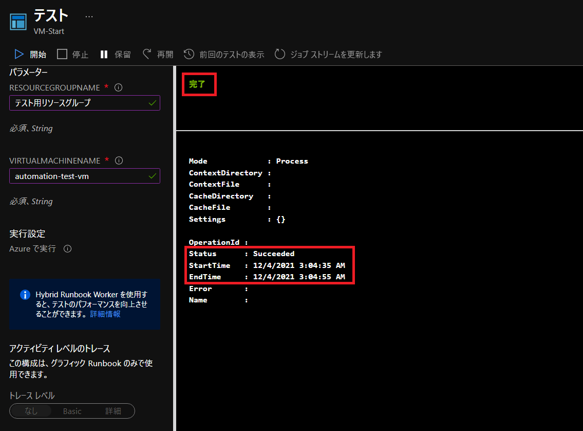 | テストが正常に終了すると、完了と表示されます。 StatusにもSucceededと表示されます。 |