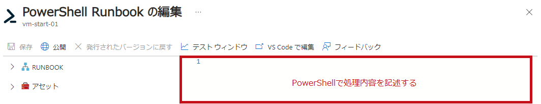 | Runbookの編集画面を表示します。 PowerShellで処理の内容を記載します。 |