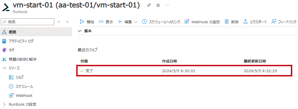 | 状態が完了となっています。 作成日時が9時30分となっており、設定したスケジュール通りRunbookが実行されたことが確認できます。 |