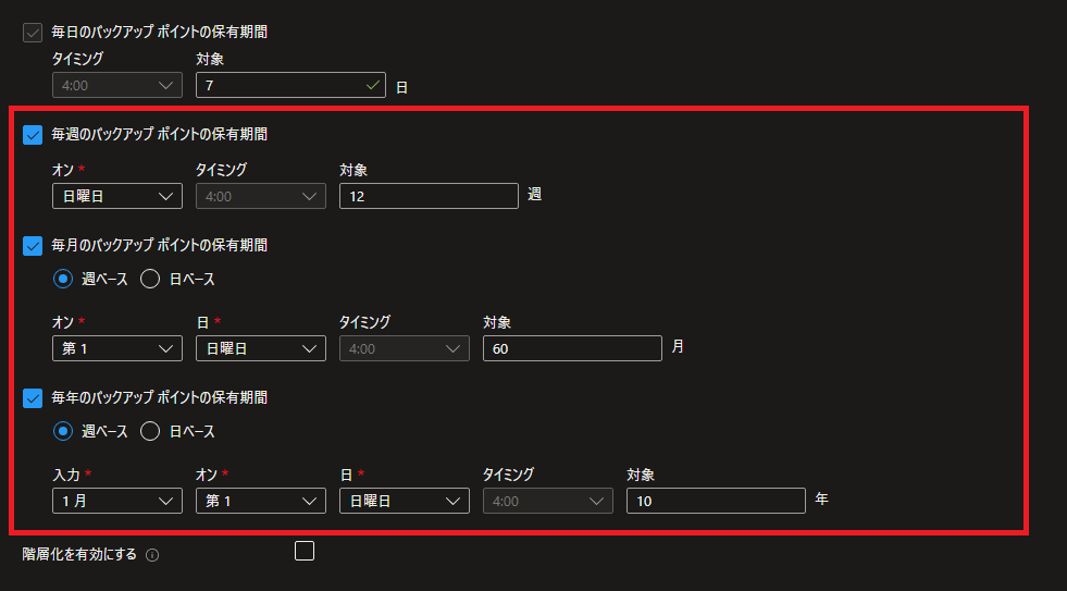 毎月のバックアップポイントもしくは、毎年のバックアップポイントを利用して場合のみ有効化できます。