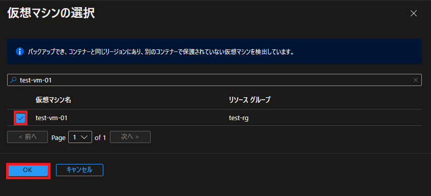| 保護されたアイテムのバックアップアイテムを選択します。 バックアップ管理の種類でAzure Virtual Machineを選択します。 バックアップ対象の仮想マシンが表示されます。 |