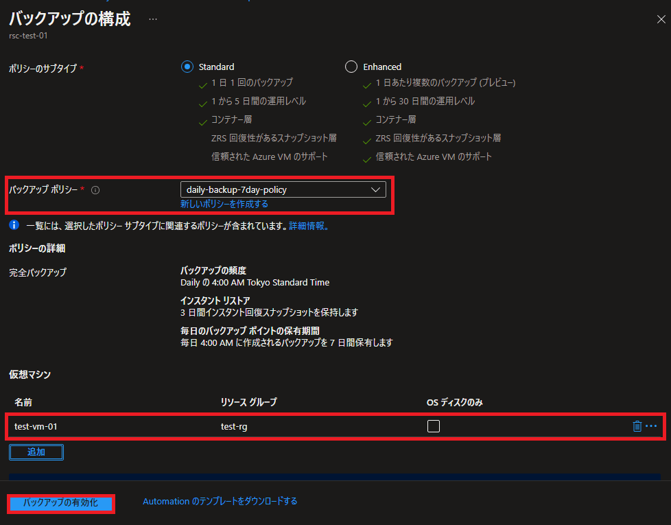 バックアップ対象の仮想マシンとバックアップポリシーを選択します。