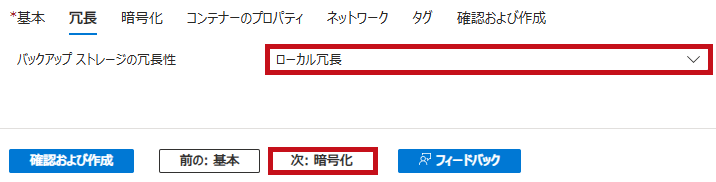 | 冗長 | バックアップ ストレージの冗長性 | ローカル冗長 |