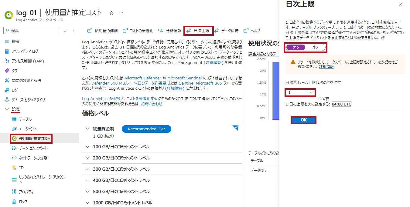 ※課金対象外のテーブル (AzureActivityなど) も上限設定の対象外となります。