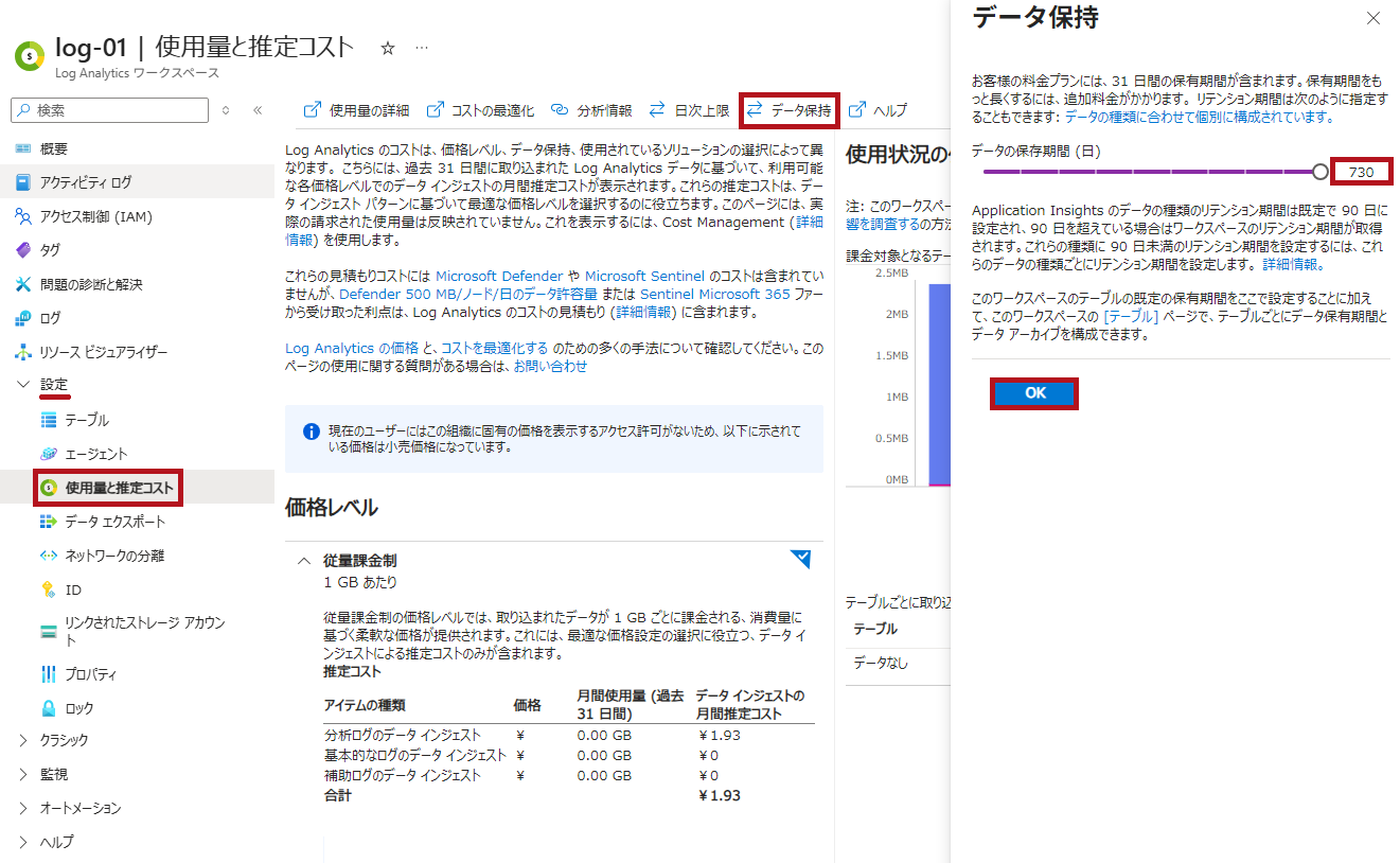 使用量と推定コストのメニューに、データ保持期間の設定項目があります。 |