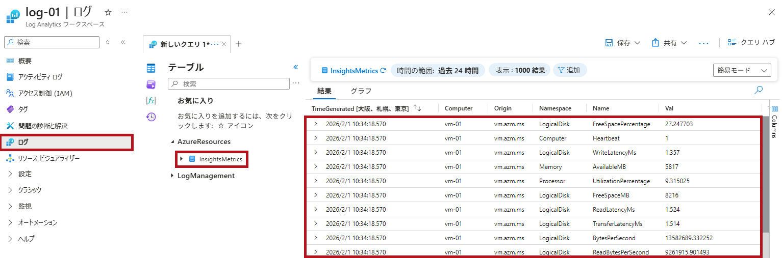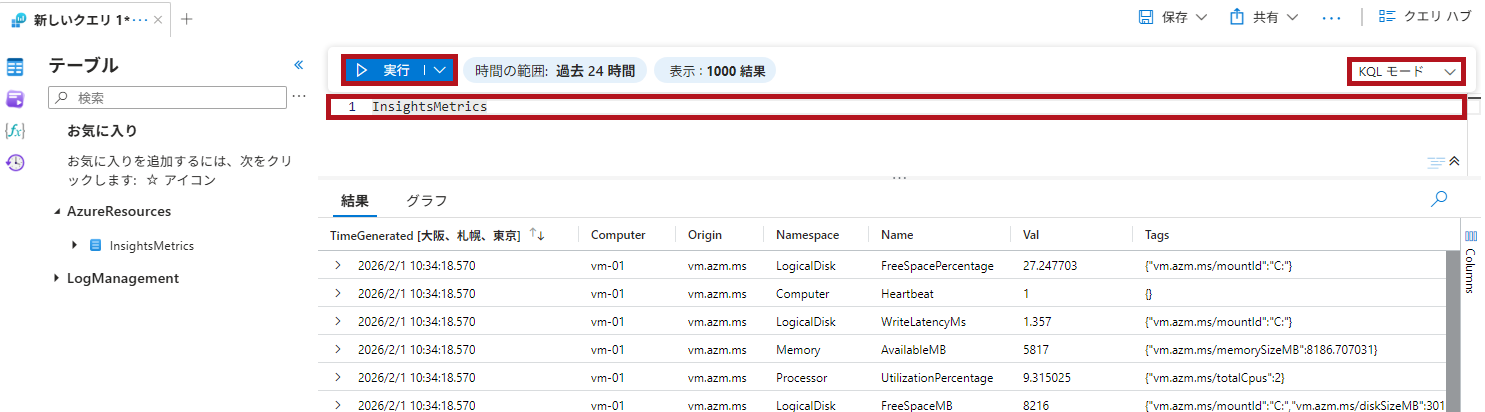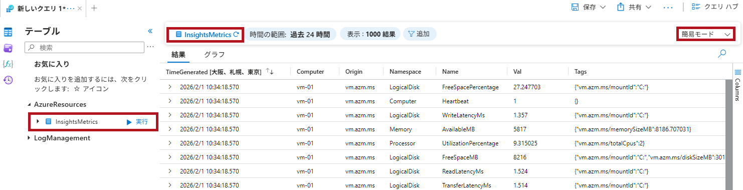 今回は、仮想マシンの分析情報(VM insights)で取得された値を例に、ログ検索を行っています。