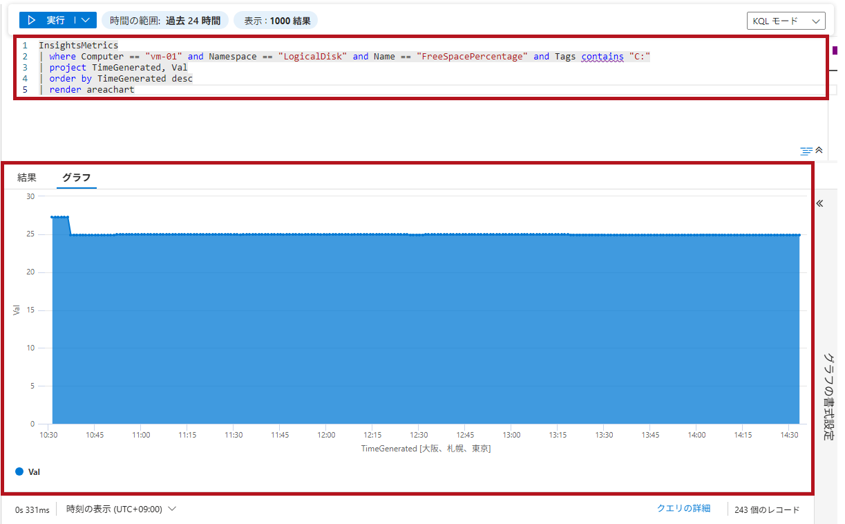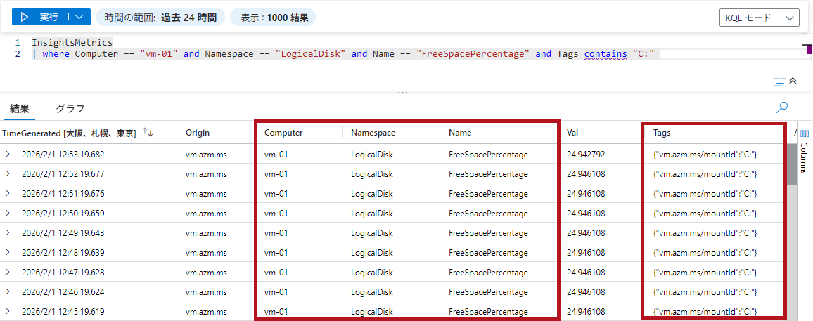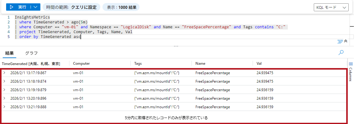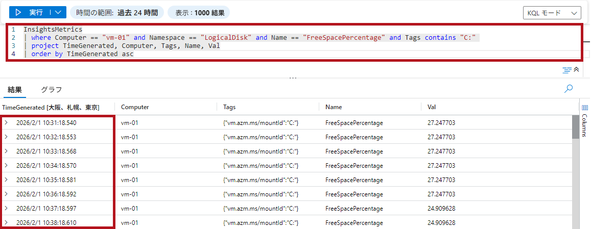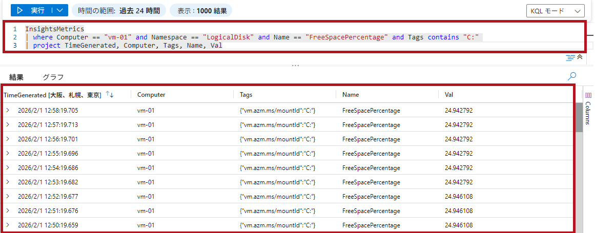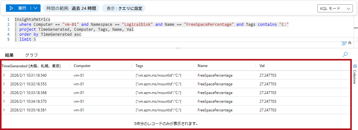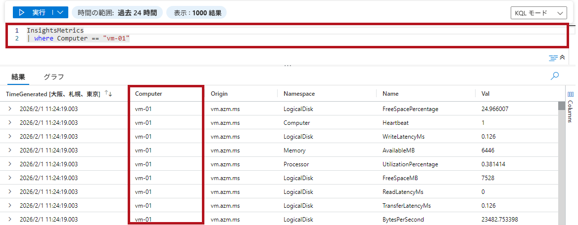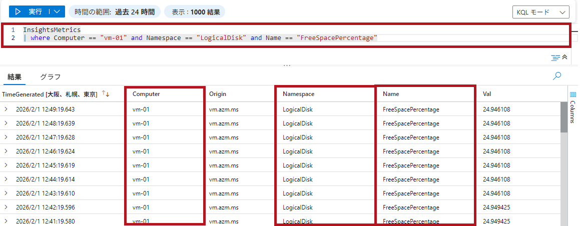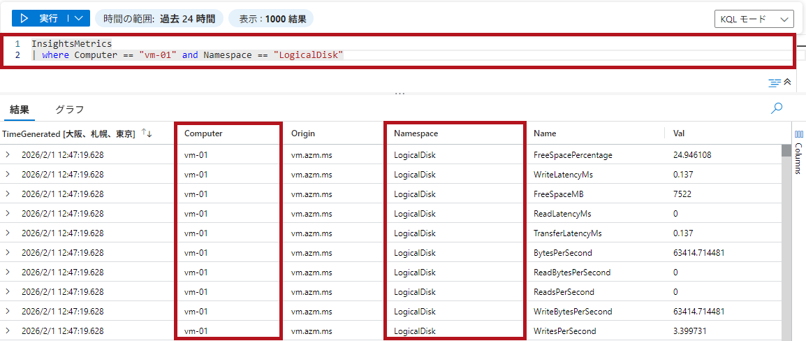 where 演算子は、and条件と組み合わせて利用することができます。 検索結果を確認すると、"vm-01″かつ取得メトリックが"LogicalDisk"のレコードのみが取得されていることがわかります。 |