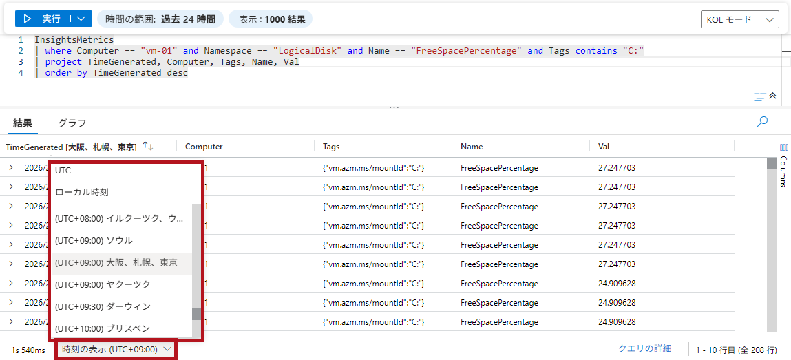 Azure Portalを利用している場合は、プルダウンでTimeGeneratedの表示時刻を選択できます。 |
