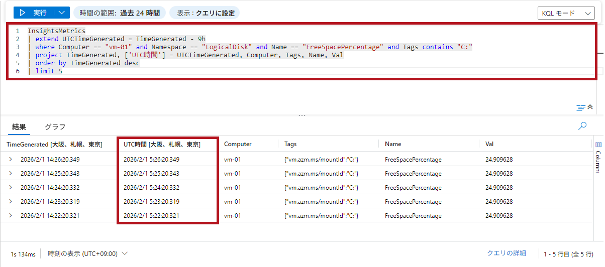 where TimeGenerated >(または<など) ago(時間)で検索範囲を指定できます。 ※ago関数は、d(日)、h(時間)、m(分)、s(秒)などの単位で指定できます。
