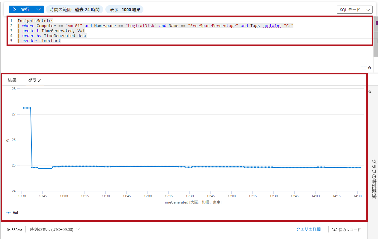 ディスク空き容量に関するレコードに絞り込むため、where Name == “FreeSpacePercentage"という条件をand条件としてクエリに追加します。