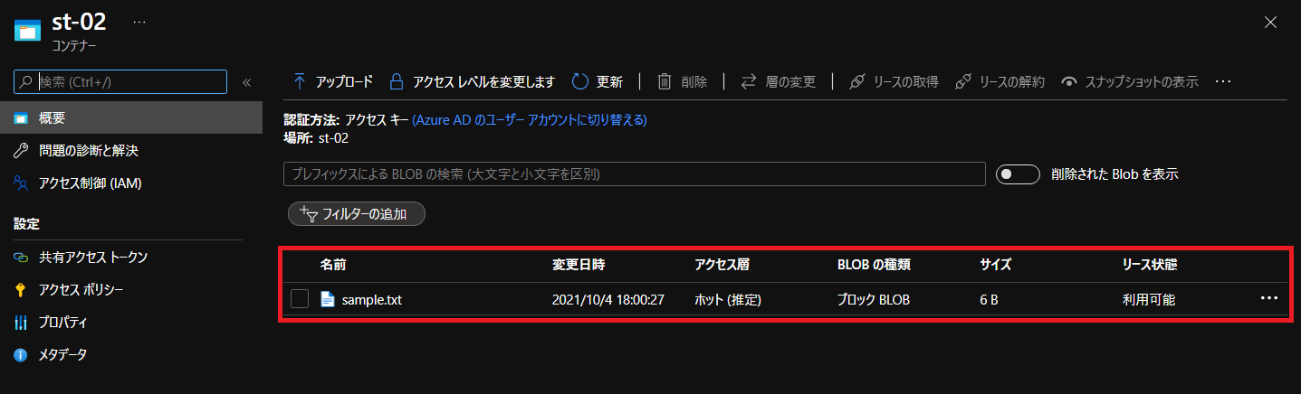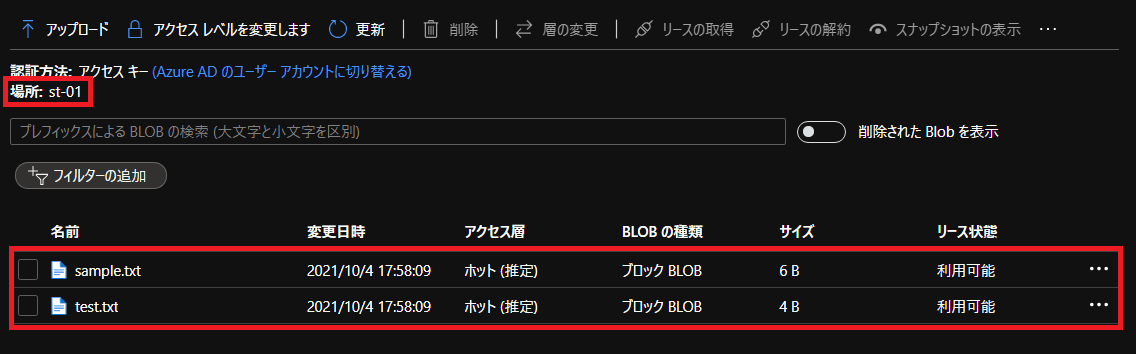 レプリケーション元のコンテナーに3つ(test01.txt、test02.txt、test03.txt)のBLOBをアップロードします。
