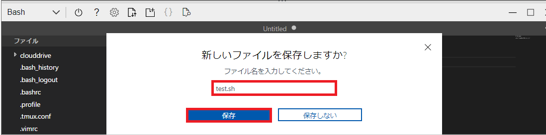 | 編集したファイルは、名前をつけてCloud Shell環境上に保存できます。 | ![]() |