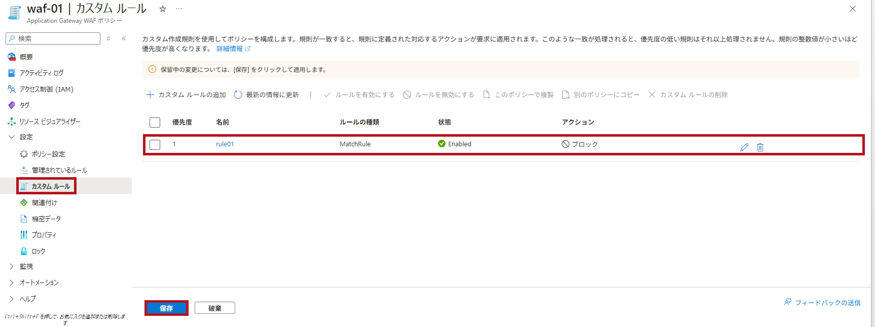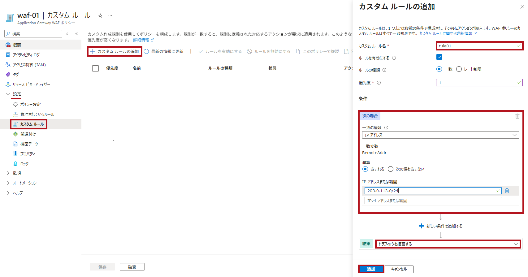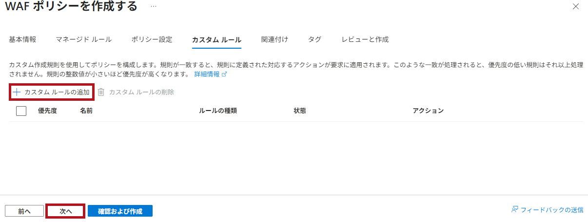 ※WAFポリシーが検出モードに設定されている場合は、カスタムルールでトラフィックを拒否すると設定した場合でもトラフィックは許可されます。