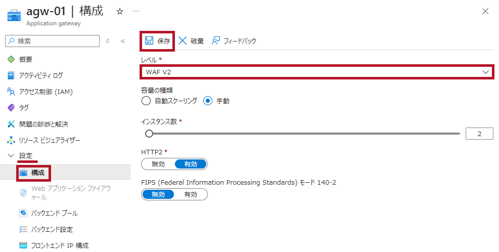 WAF機能を有効化する場合は、Application GatewayのSKUにWAF v2を選択します。
