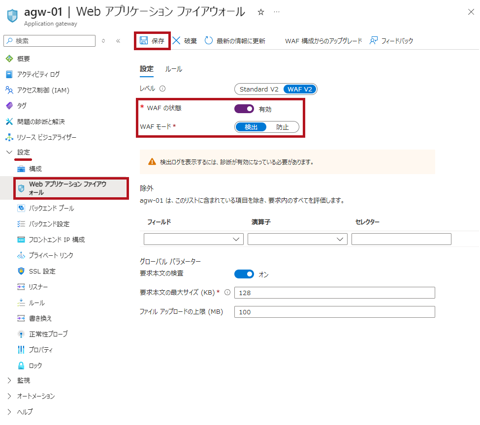 Azure Application GatewayのWAF有効化から、WAFポリシー設定、カスタムルール作成、ログ確認までの手順