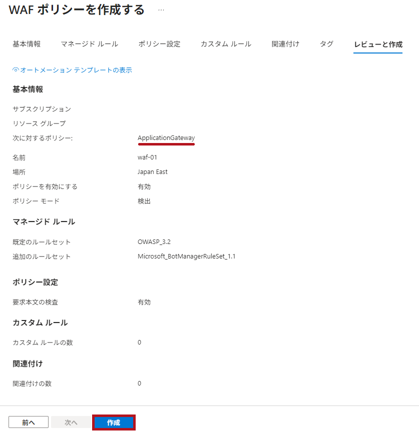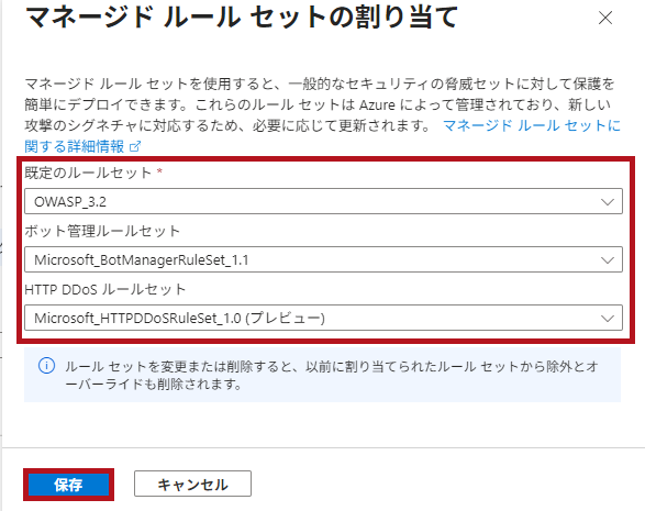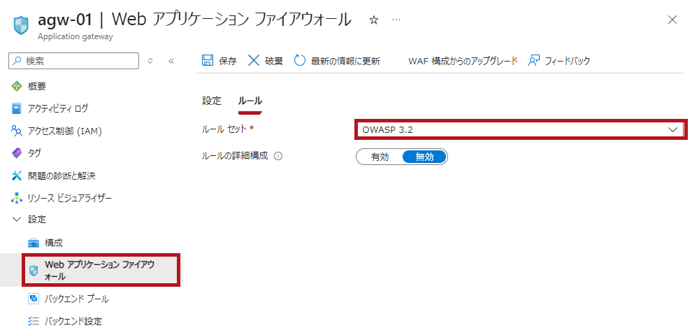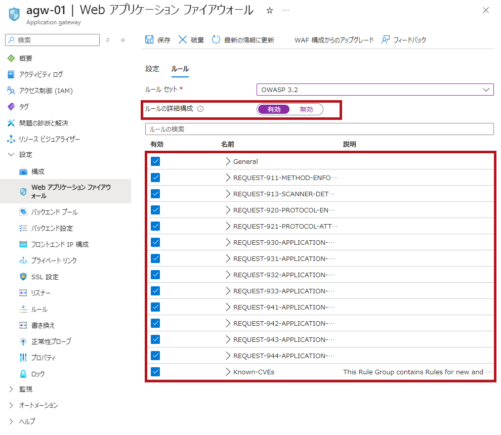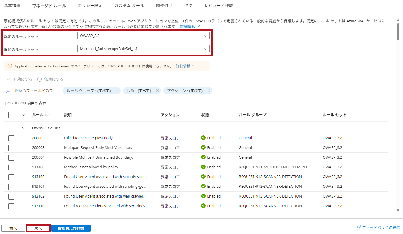 ※今回、画面例ではOWASP 3.2を選択していますが、記事更新日時点ではMicrosoft_DefaultRuleSet 2.1が推奨されています。