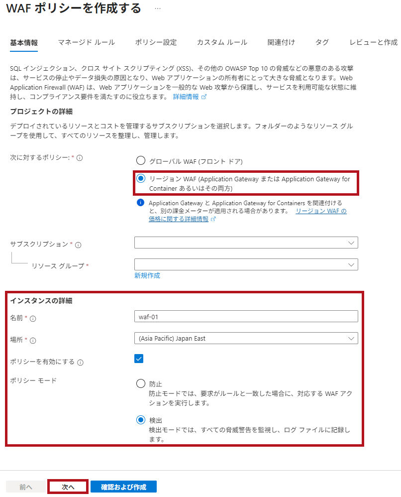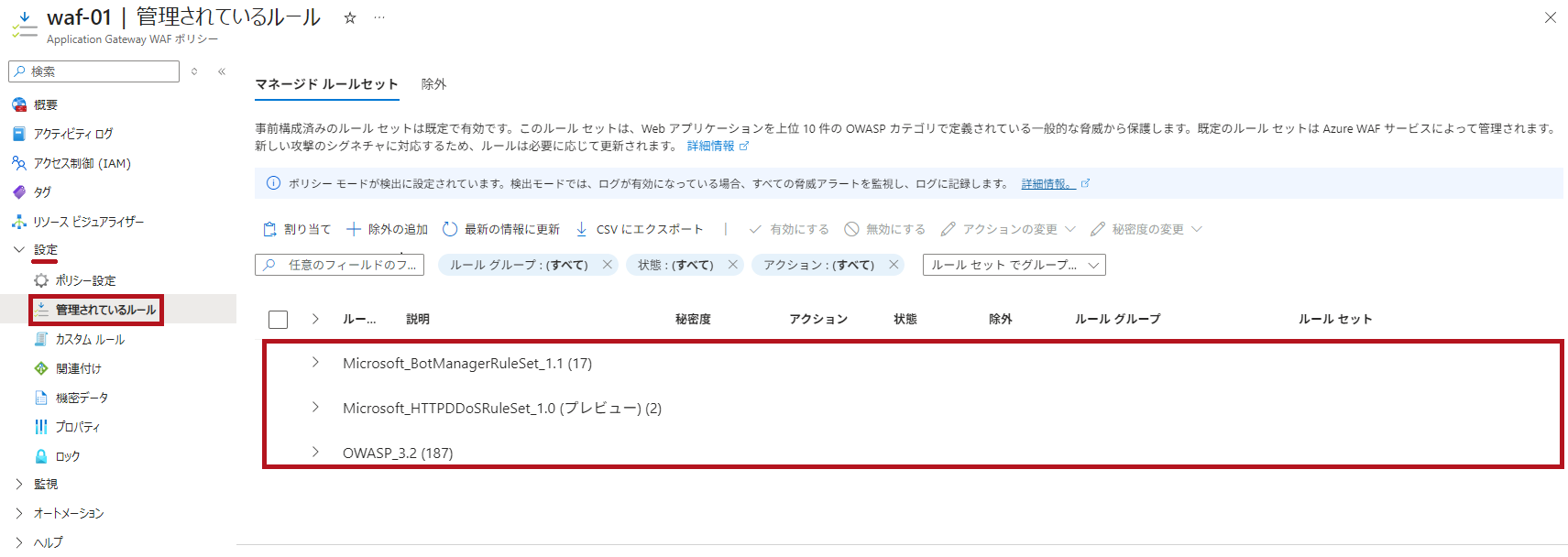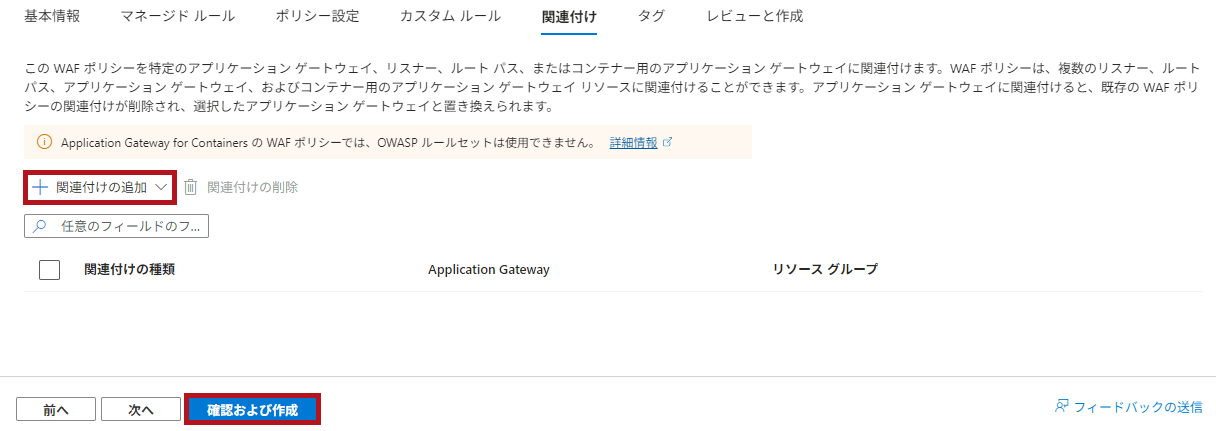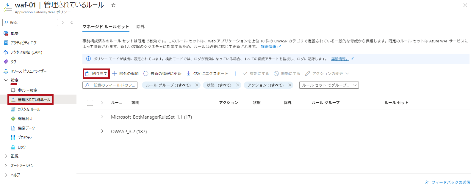 ※今回、画面例ではOWASP 3.2を選択していますが、記事更新日時点ではMicrosoft_DefaultRuleSet 2.1が推奨されています。