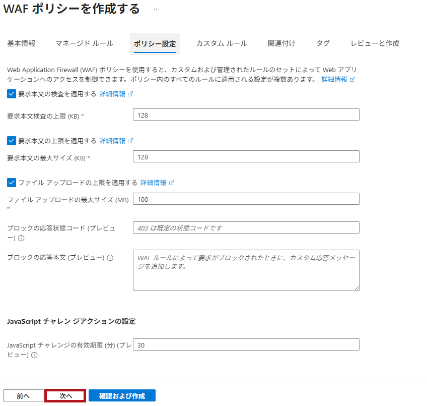 ※なお、Front Doorに適用するWAFポリシーと、Application Gatewayに適用するWAFポリシーでは設定できる内容に差異があります。