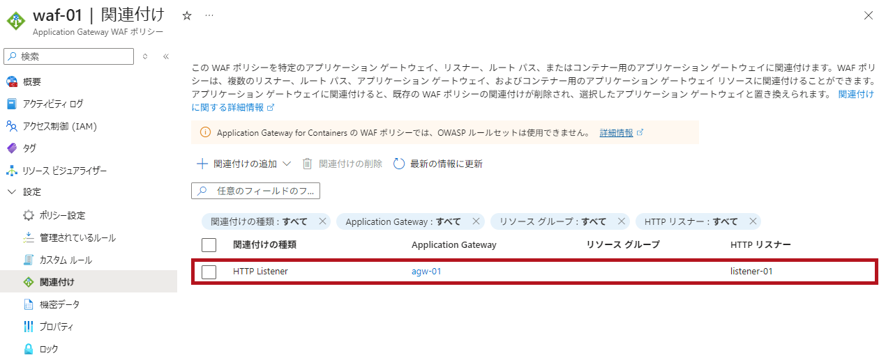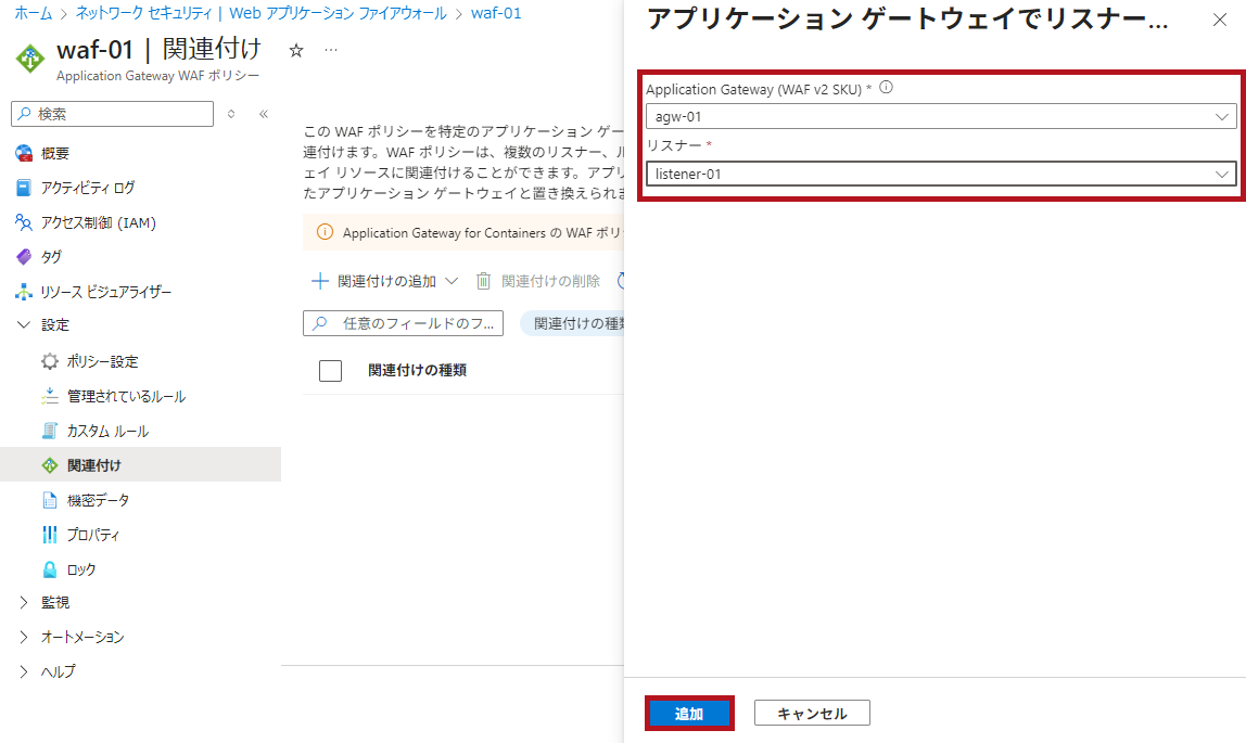 | 関連付けするApplication GatewayのリソースとHTTPリスナーを選択します。 追加を選択します。 追加が完了すると、WAFポリシーが関連付けられたリソースが表示されます。 |