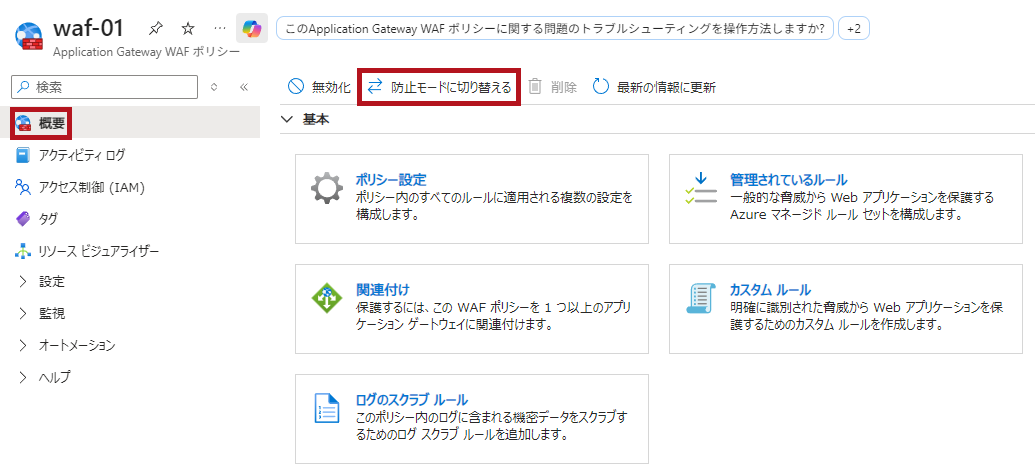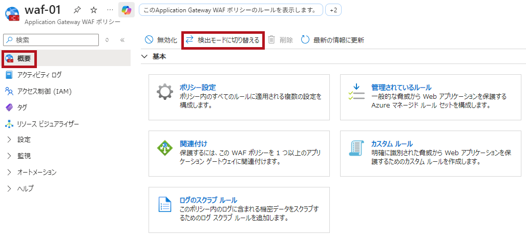 WAFポリシーの防止モード、検出モードの切り替え手順