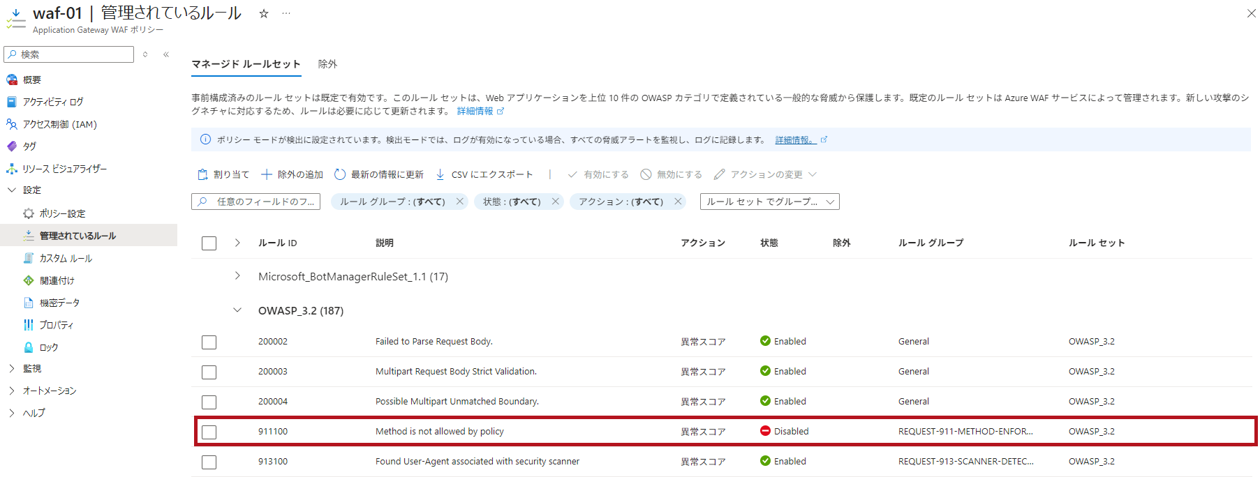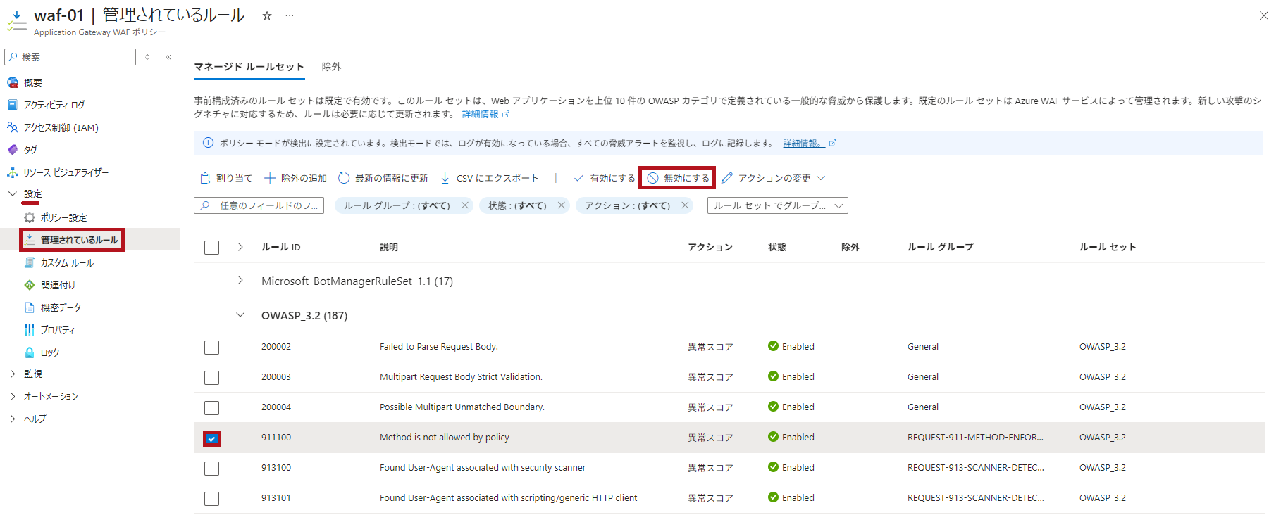 WAFの検知モードと防止モードの切り替えやルールの無効化設定