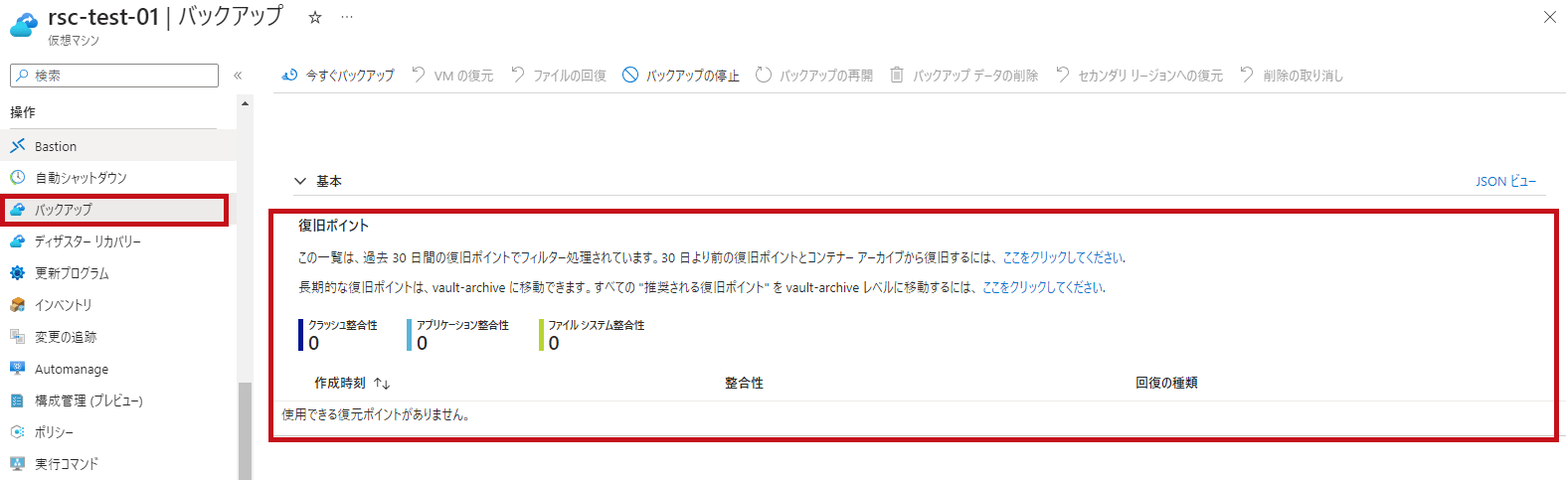 ※今回はrsc-test-01という仮想マシン(Azure VM)でバックアップ有効化しています。