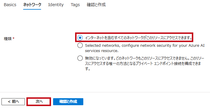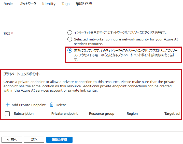 ネットワーク設定です。 仮想ネットワーク サービス エンドポイント経由で Speech サービスを使用する サービスエンドポイント、プライベートエンドポイントを利用をする場合は、カスタムドメイン名の設定が必要です。