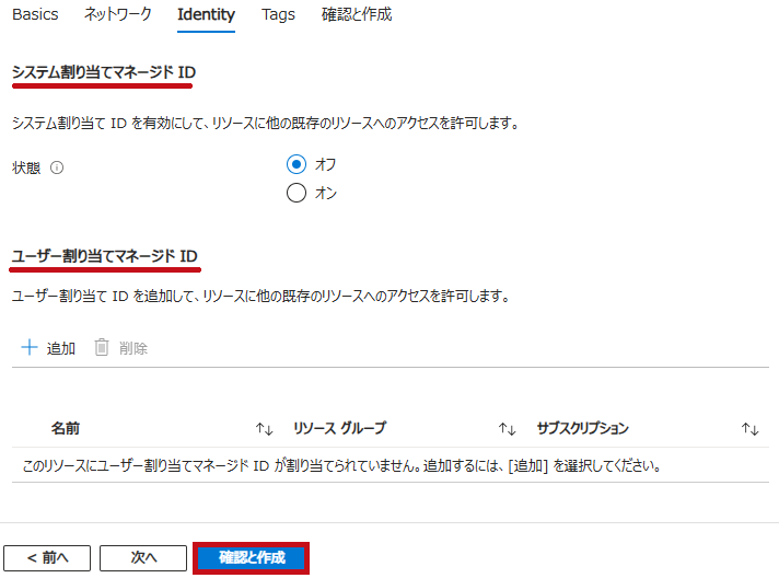 | マネージドIDの設定です。 システム割り当てマネージドIDの有効化や、ユーザー割り当てマネージドIDを選択します。 |