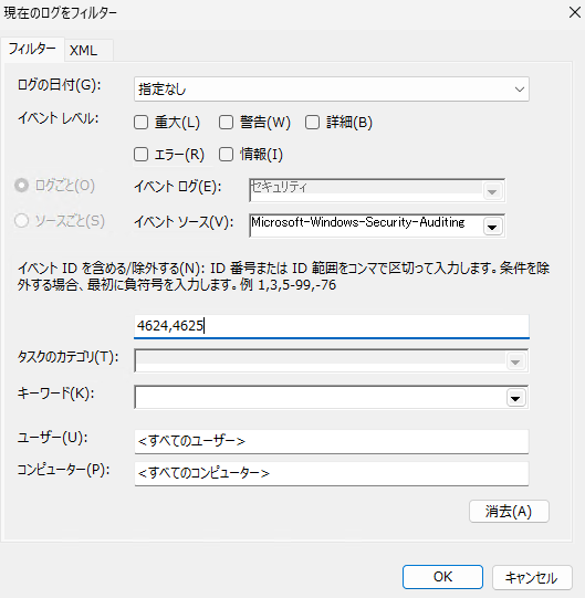 イベントID | 4624(正常なログオン) 4625(ログオンエラー) |