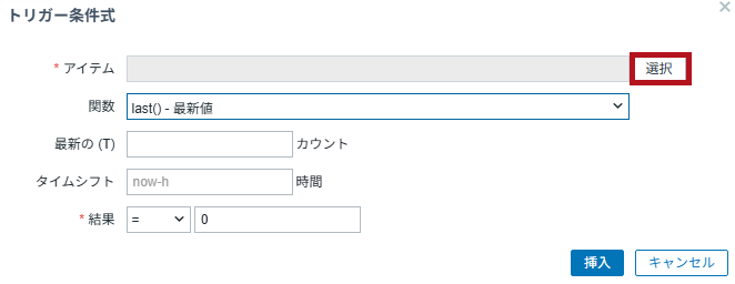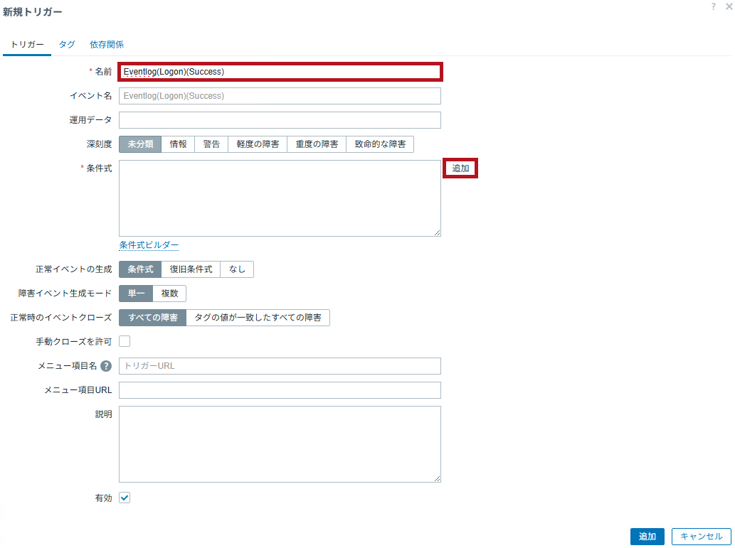 新規トリガー作成画面が表示されます。 トリガー名を設定します。 条件式の追加を選択します。 |