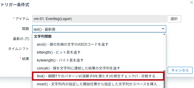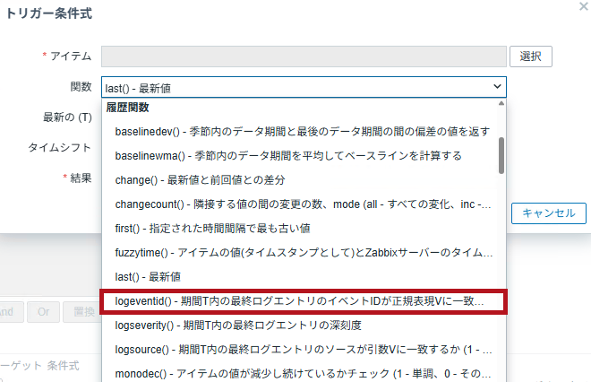 トリガー条件式の設定画面が表示されます。 作成したイベントログのアイテムを選択します。 |