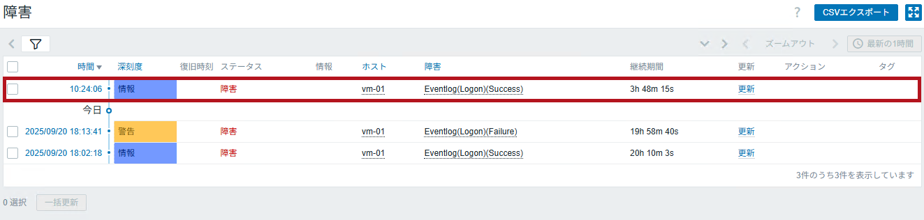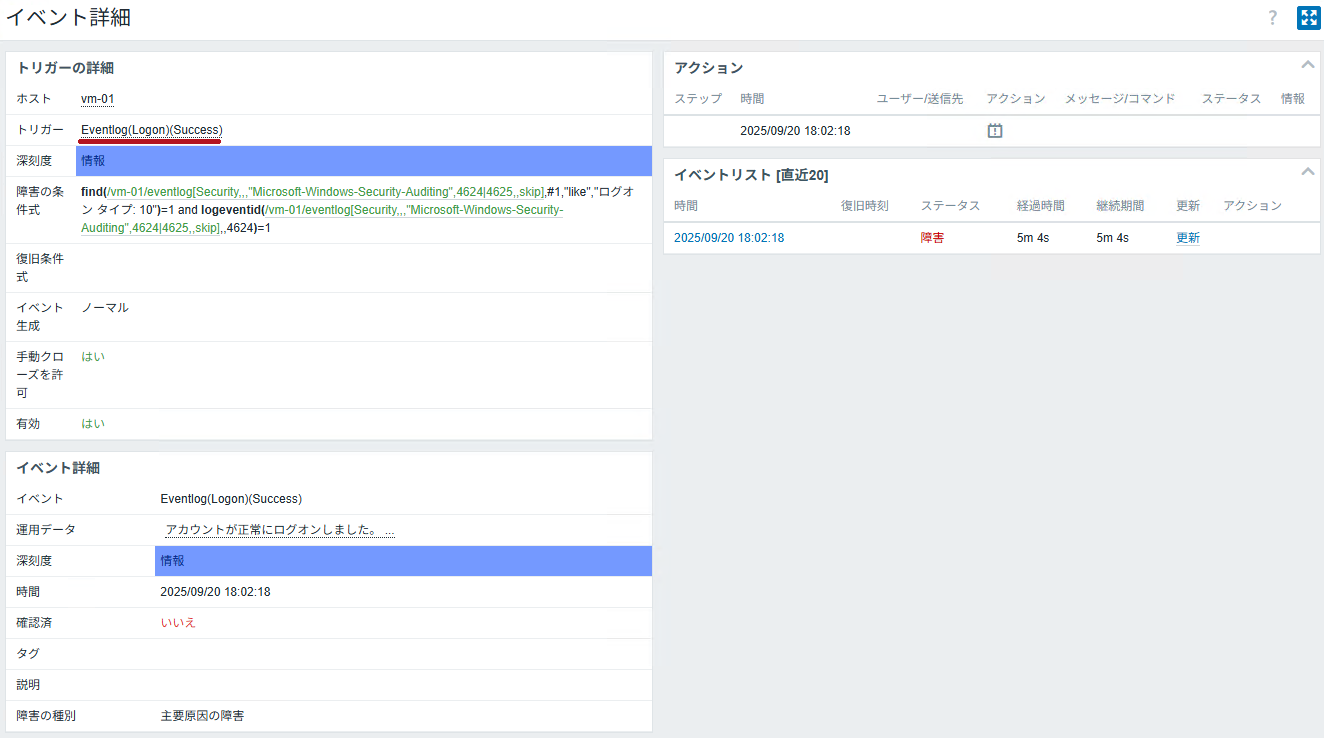 イベントログを確認します。 Zabbixに収集されたイベントログに基づき、検知されていることが確認できます。 |