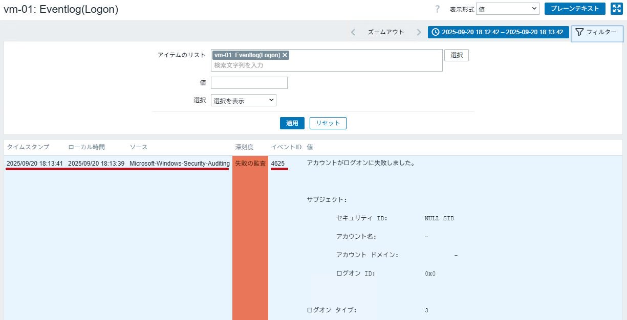 監視対象のWindowsホストでログオンエラーのイベントログを発生させ、Zabbixで障害検知できるかを確認します。